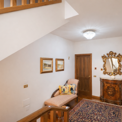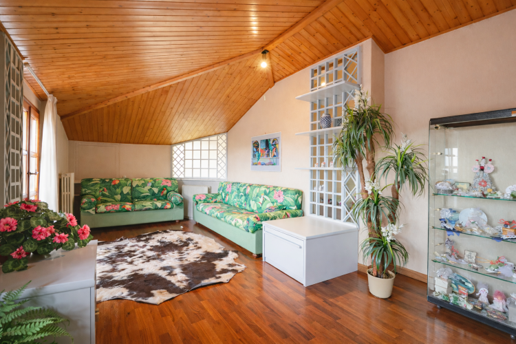 Al piano superiore è presente una bellissima e ampia sala mansardata che è probabilmente l’ambiente più particolare di tutta la casa. Intima e raccolta, è perfetta come area relax, giochi, lettura o studio. Da qui si accede ad un piccolo terrazzino con la stessa ampia vista degli altri.