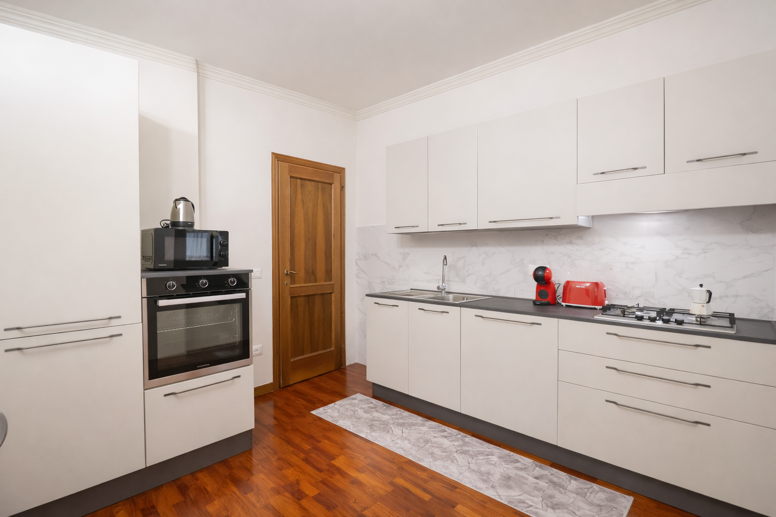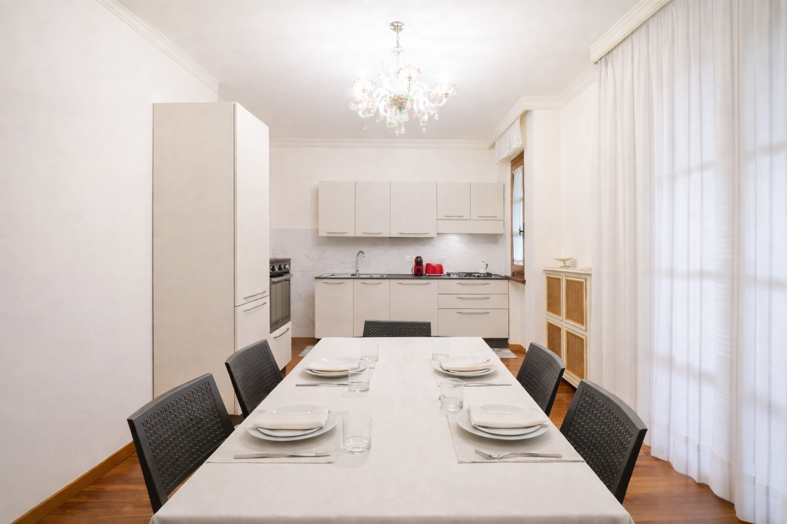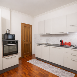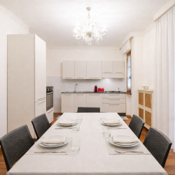 La cucina è ampia e ben attrezzata: forno, forno a microonde, piano cottura a quattro fuochi, lavastoviglie, frigorifero e utensili di qualità si integrano in uno spazio funzionale e raffinato. L’ampio tavolo per sei persone è perfetto per la convivialità degli ospiti. Da qui si accede ad un altro terrazzo esterno dove vi è presente una lavatrice.